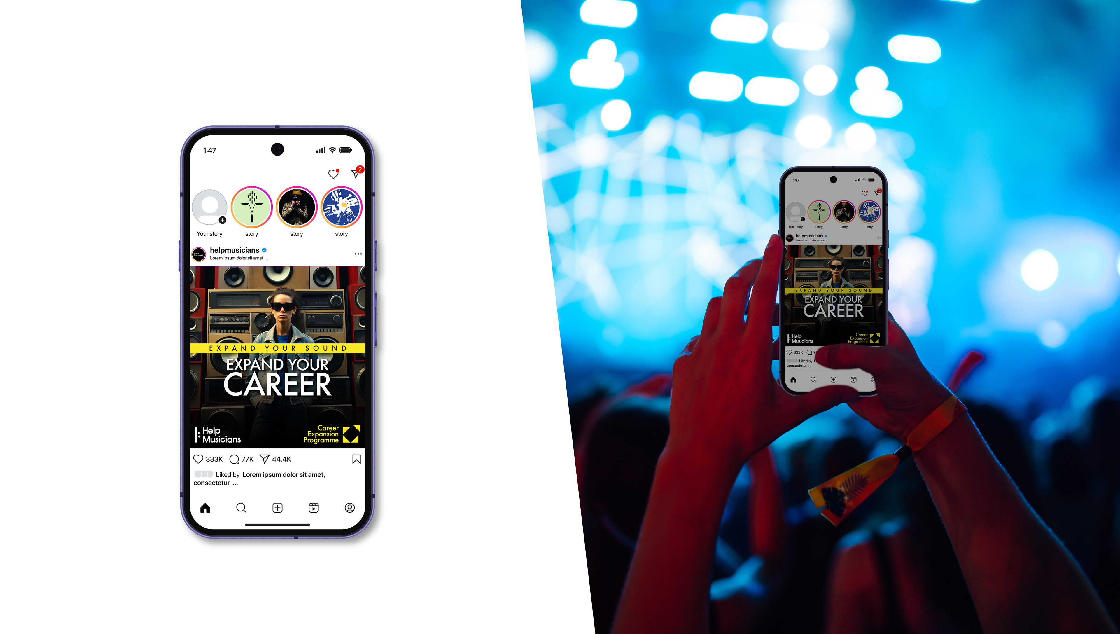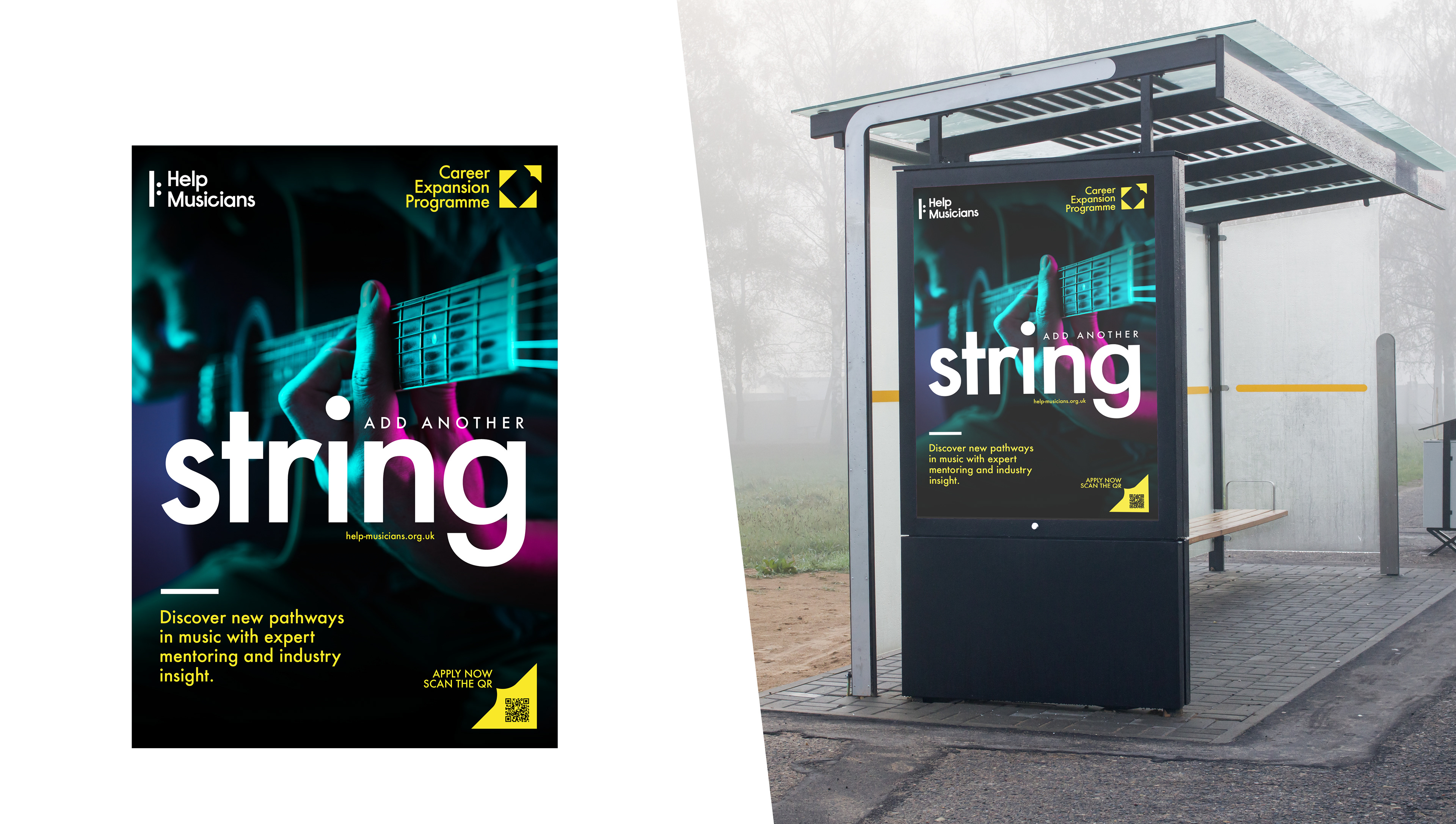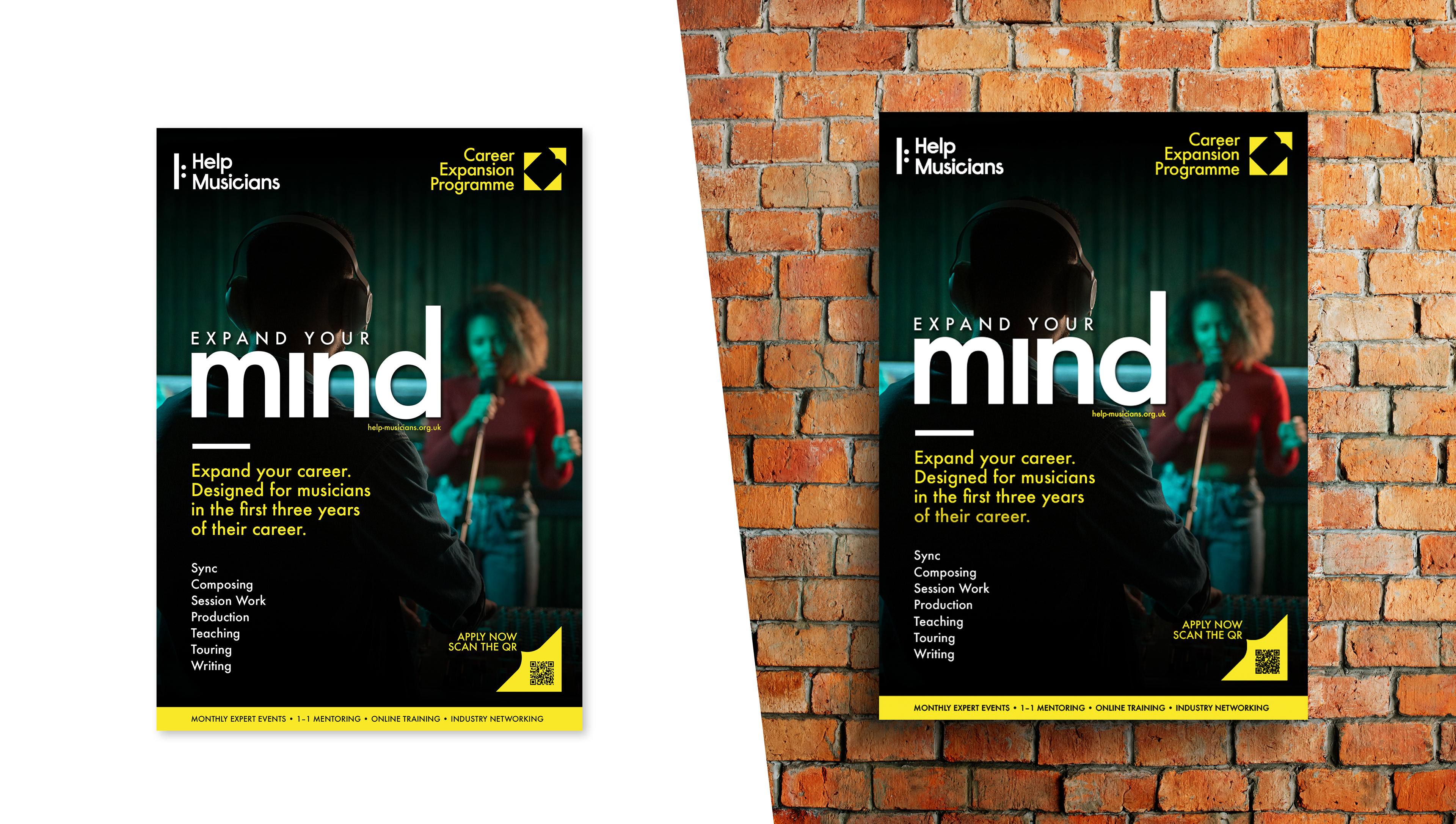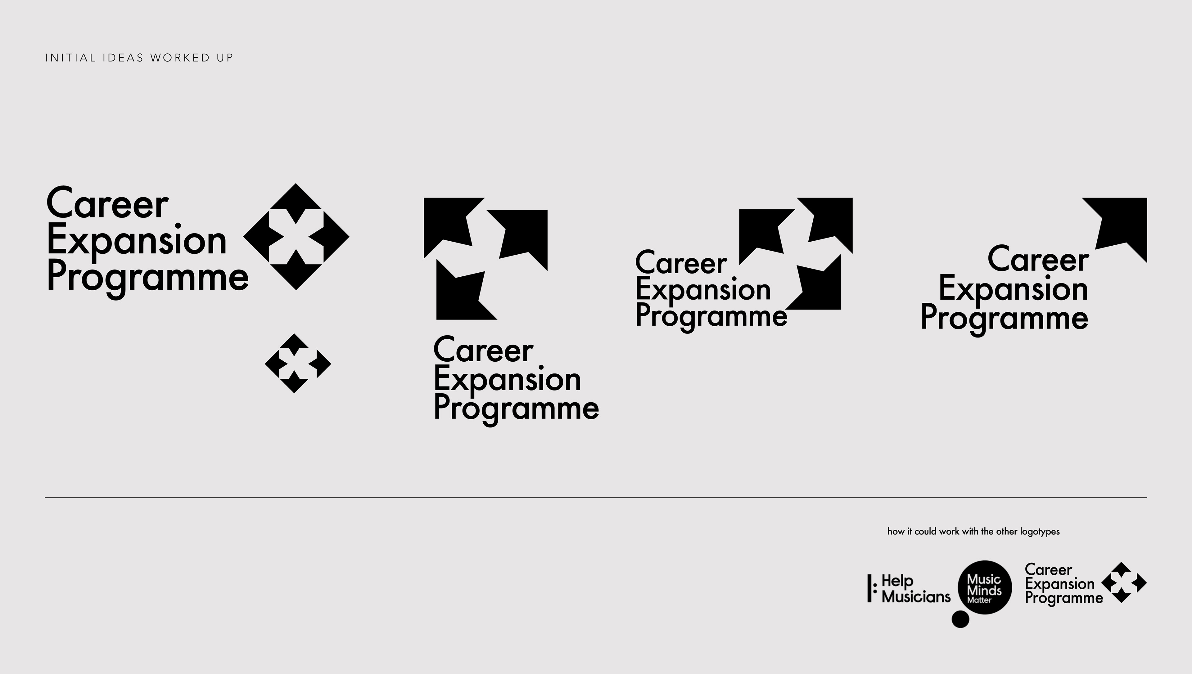 Visual Identity design for Help Musicians new service called Career Expansion Programme. It is designed to help musicians diversify their careers by teaching them about other areas of music and performance they could pursue alongside their current work. The programme includes monthly in-person speaking events with industry experts on sync, composing, and session playing; six mentoring sessions per participant; access to online webinars; monthly resources and guidance on musical careers; and a one-time in-person networking event.
