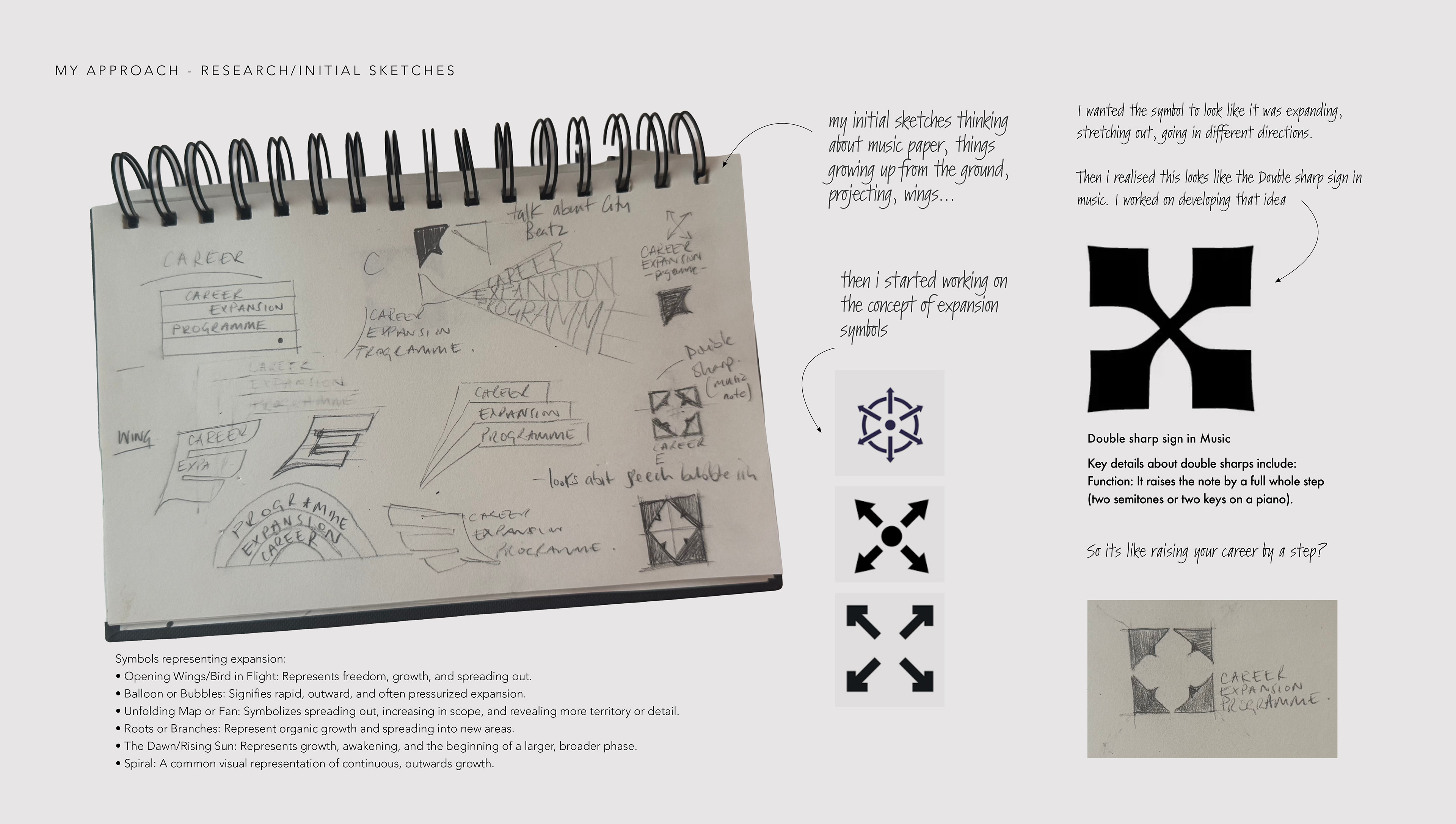 I then focused more clearly on the idea of expansion itself, aiming to create a symbol that appeared to stretch and extend in multiple directions. During this process, I realised that one of my designs resembled the double sharp symbol in music, which raises a note by a whole step. This felt like a strong conceptual link—visually and metaphorically suggesting the idea of elevating or advancing a career.