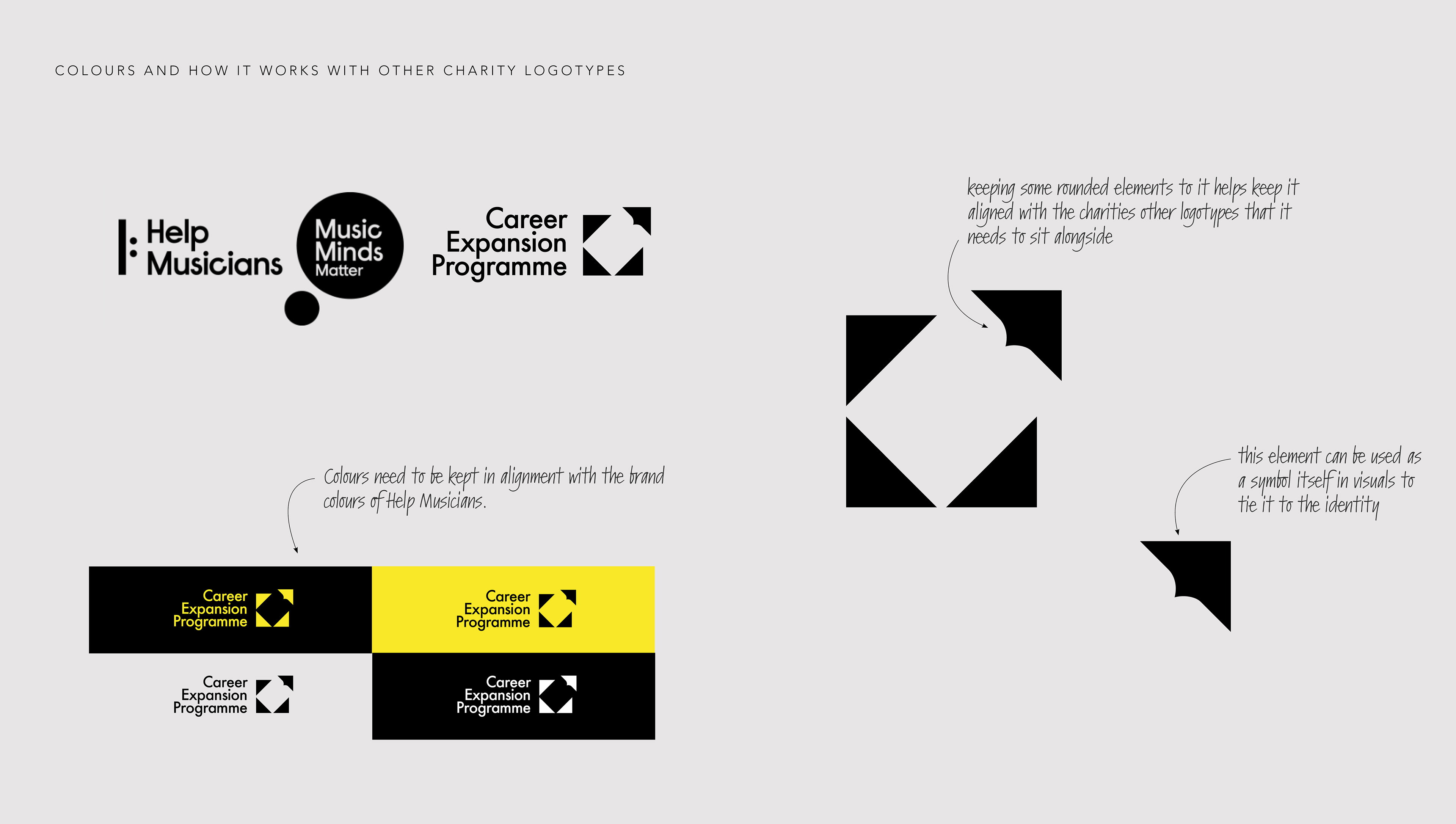 From there, I refined the concept into a final symbol, ensuring it remained dynamic while also fitting alongside the existing Help Musicians logotypes. I kept some rounded elements to maintain consistency with the wider brand and considered how parts of the symbol could be used independently across different visuals. Throughout the process, I also ensured the colours remained aligned with the established Help Musicians brand identity.